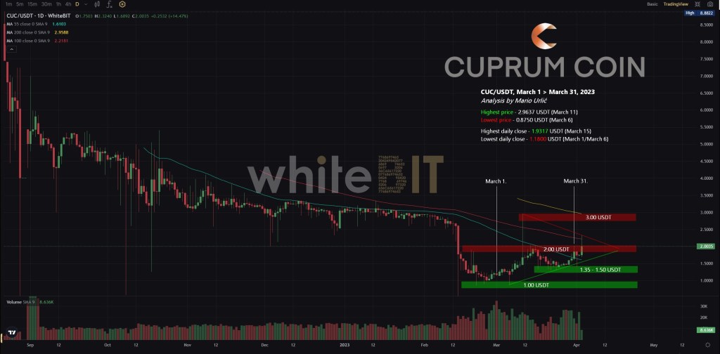 On the last day of March, CUC/USDT closed above the daily MA 55 (green line), which is the first time since we have that indicator on the chart. Although this is significant from the technical side, the daily MA 100 (red line), which is currently at the level of around 2.20 USDT, is now a challenge for the buyers. Also, during March, we got the daily MA200 (yellow line) for the first time, which is also a very important factor from the technical side.